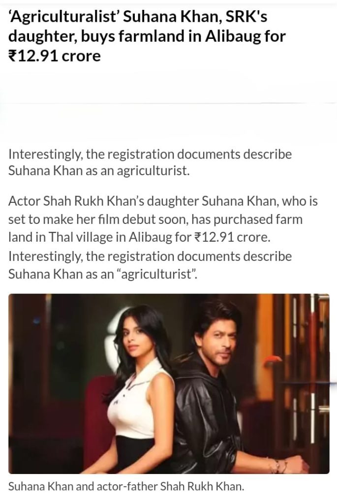 Bollywood superstar Shah Rukh Khan’s daughter Suhana Khan finds herself in legal trouble after buying farmland in Thal village, Alibaug, Maharashtra. She bought about 1.5 acres of agricultural land, including a constructed area of more than 2200 square feet, for ₹12.91 crore in June 2023. The property was registered on June 1, and she paid about ₹77 lakh as stamp duty. The transaction was entered into under DĂ©jĂ Vu Farm Private Limited, a firm in which her aunt Namita Chhibber and grandmother Savita Chhibber are directors. The property was purchased from three sisters, Anjali, Rekha, and Priya Khot, who had inherited it from their parents.
